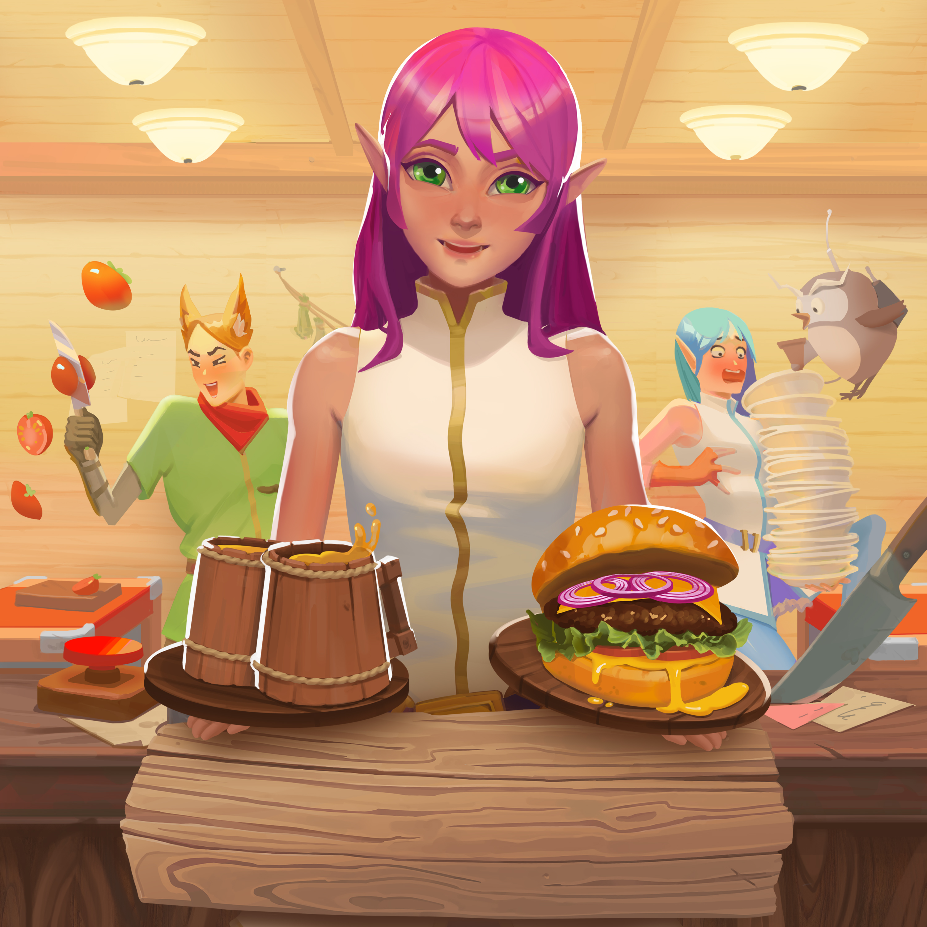 Волшебный мир фэнтези ждет, где ты станешь частью команды, спасая репутацию легендарной таверны! Пока хозяин в странствиях, на тебя ложится ответственность обслуживать шумных гостей: эльфов, магов, рыцарей и многих других. Готовь блюда, разливай напитки, не давая посетителям ждать. Каждый успех принесет славу, а неудачи — хаос и разрушение! Успех зависит от командной работы и мастерства в управлении временем. Собери команду, улучшай таверну, разблокируй новые рецепты и превращай заведение в легенду фэнтезийного мира.